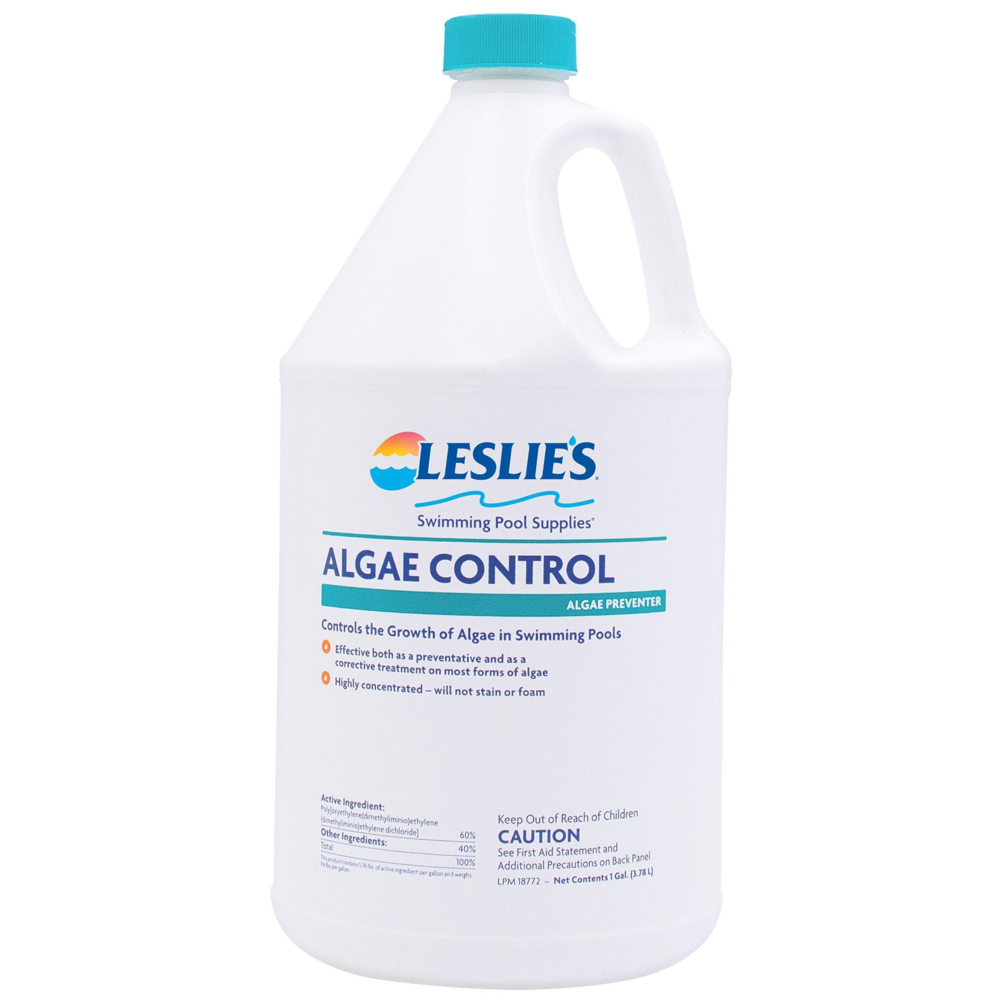 - For pools having just visible algae growth, add an initial dose of 11 to 16 fluid ounces of Leslie's Algae Control Pool Algaecide and Algae Preventer per 10,000 gallons of water and remove settled algae.