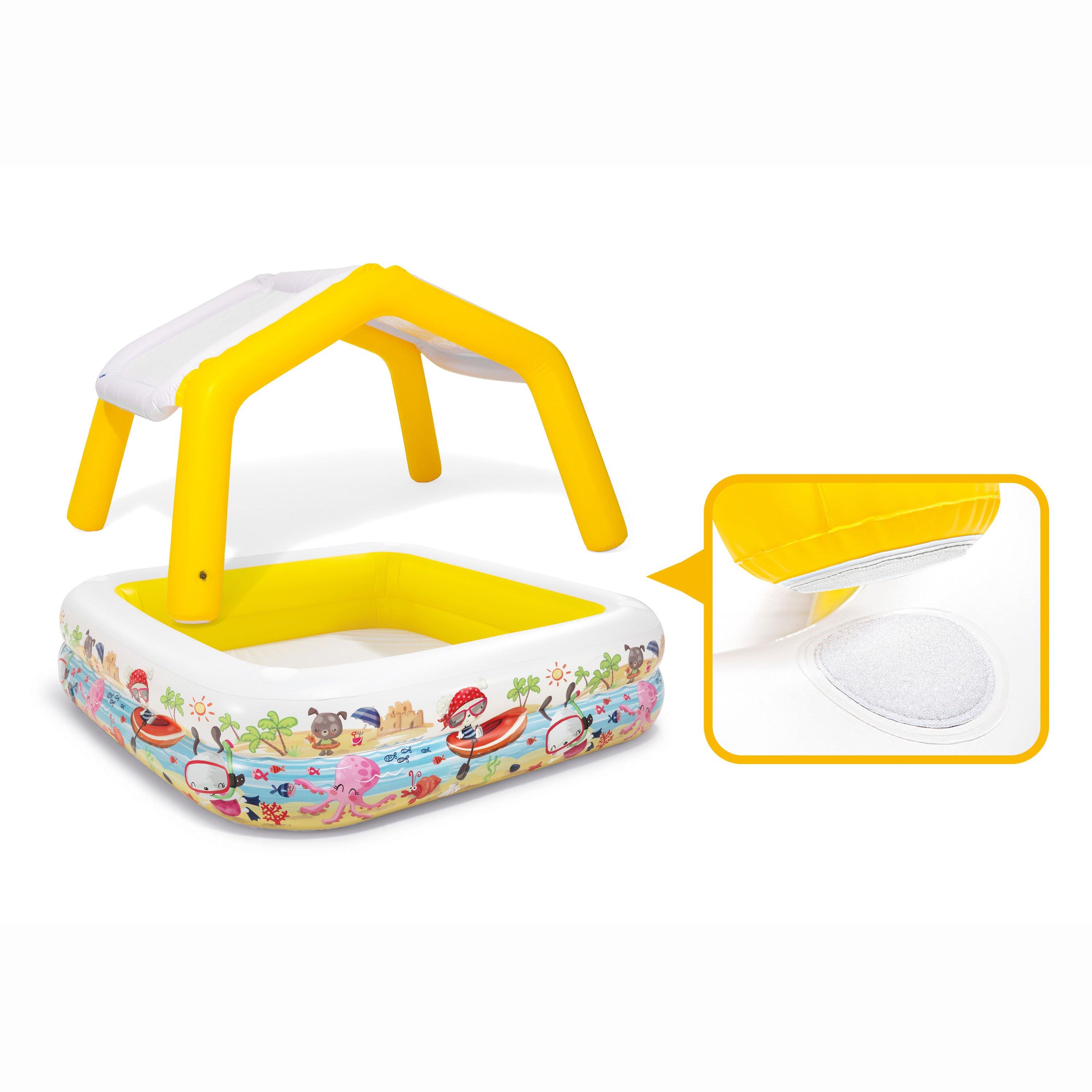 Splash and play this summer in the shade with this fun Intex Sun Shade Pool! The wide side walls and the extra-wide sun shade allows for maximum play in shady comfort. The inflatable sun shade is removable, simply detach from the pool and enjoy play in the sun. The stylish ocean scene adds some fun and adventure for young children.